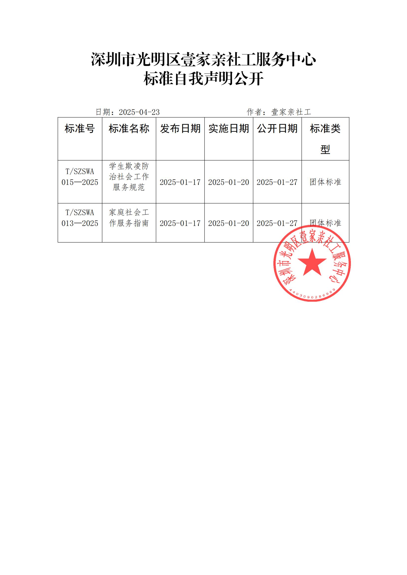 深圳市光明区壹家亲社工服务中心 标准自我声明公开
